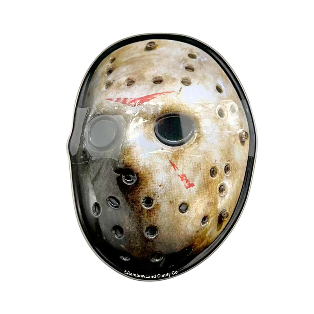 This collectible Jason Voorhees mask tin brings slasher vibes to your candy collection and hides a wicked treat inside: sour cherry candy cleavers!
